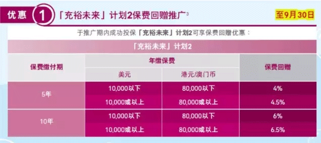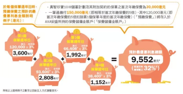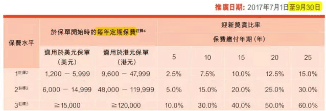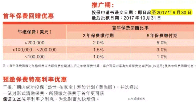 由2017年6月28日至12月22日期間,只須投保全新真智珍寶Ⅲ儲蓄系列(或其簡化版)(保費繳付年期為10年或以上)保單(指定基本計畫及其附加契約),並支付5倍的首次年繳保費,且首次年繳保費不低於3萬港元/3,750美元,您即可就預繳保費獲享每年3%最優惠保證利率,直至第4個保單周年日。
