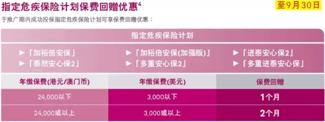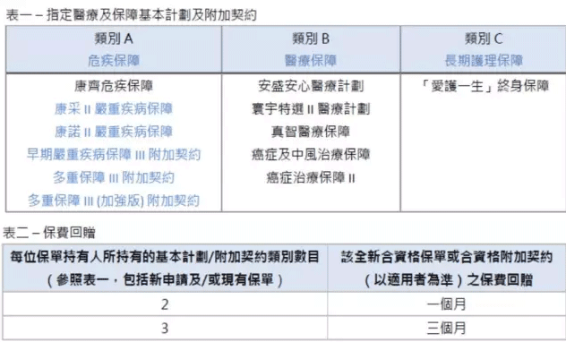 在2017年5月29日至2017年8月25日期間,成功投保下表一的指定全新醫療及保障基本計畫及/或附加契約,並符合以下表二的持有保單類別數目要求(包括新申請及/或現有保單),每份全新合資格保單/合資格附加契約既有機會獲享高達三個月保費回贈!