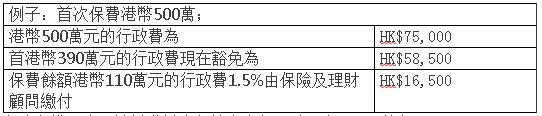 (3)首次保費的上限為美金50萬元(港幣390萬元)。超過港幣390萬元的保費將會收取正常的行政費用及由保險/理財顧問支付,Visa/萬事達卡行政費為1.5%