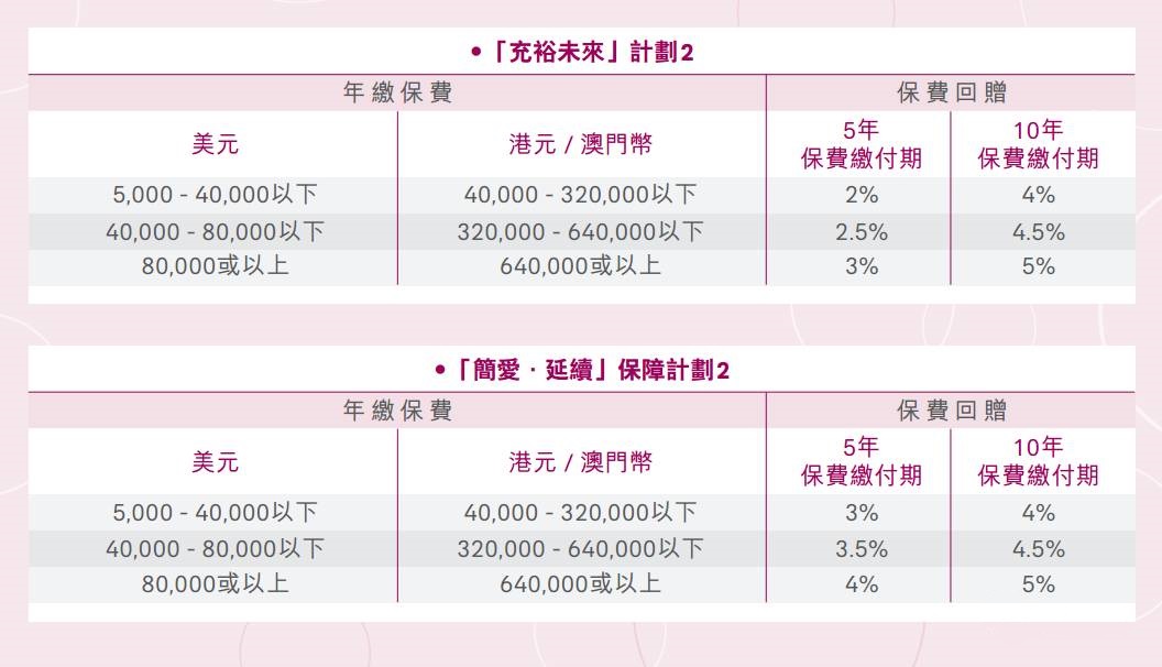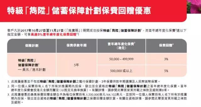 於2017年10月10日至11月30日(「推廣期」),客戶成功投保「充裕未來2」/「简爱 延续2」/「裕滿人生2」/「愛無憂長享計劃3」/「活出精彩」保障儲蓄計劃,可享受保費回贈優惠: