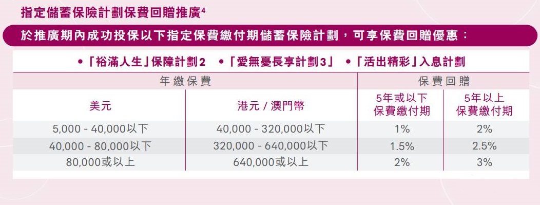 1)指定儲蓄保險計劃保費回贈推廣