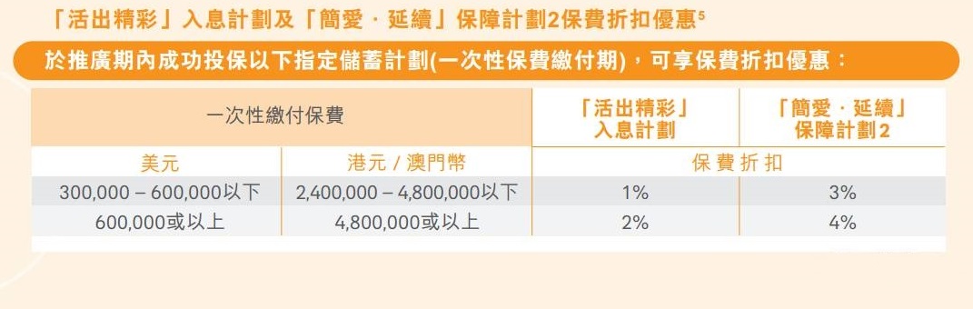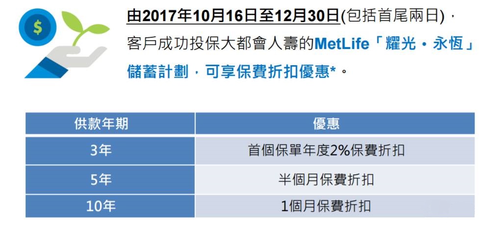 優惠內容:由2017年9月8日至12月30日,客戶成功投保耀光永恆儲蓄計劃可享保費優惠。具體優惠資訊如下: