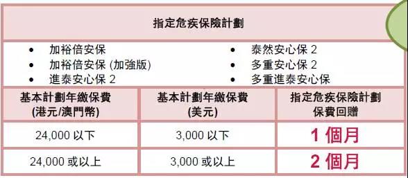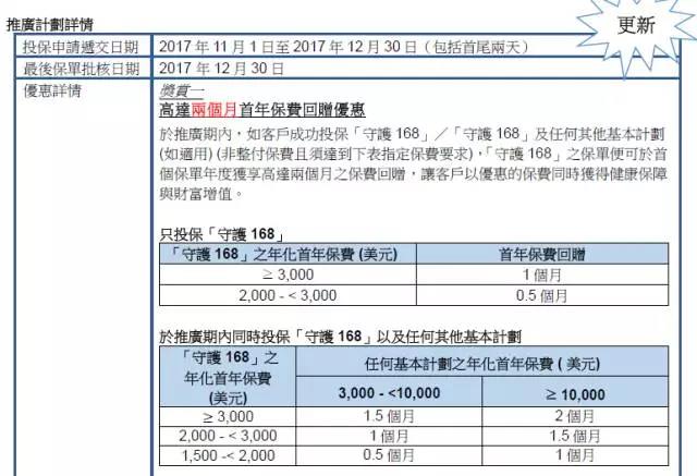 優惠內容:客戶凡於推廣期2017年11月30日前成功投保「加裕倍安保(加強版)」「多重安心保2」等重疾產品,可獲得最多兩個月保費回贈,「充裕未來」計劃2最高保費回贈5%,具體優惠資訊如下: