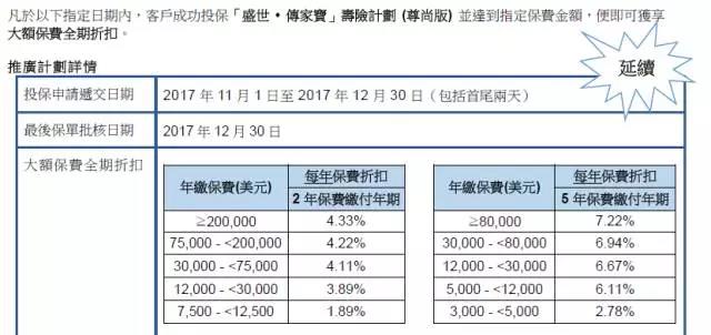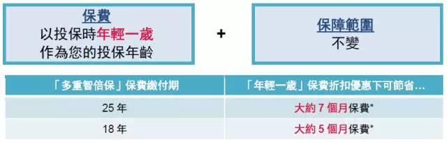 於2017年10月10日至11月30日(「推廣期」),客戶成功投保「多重智倍保」可享「年輕一歲」保費折扣優惠: