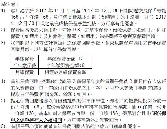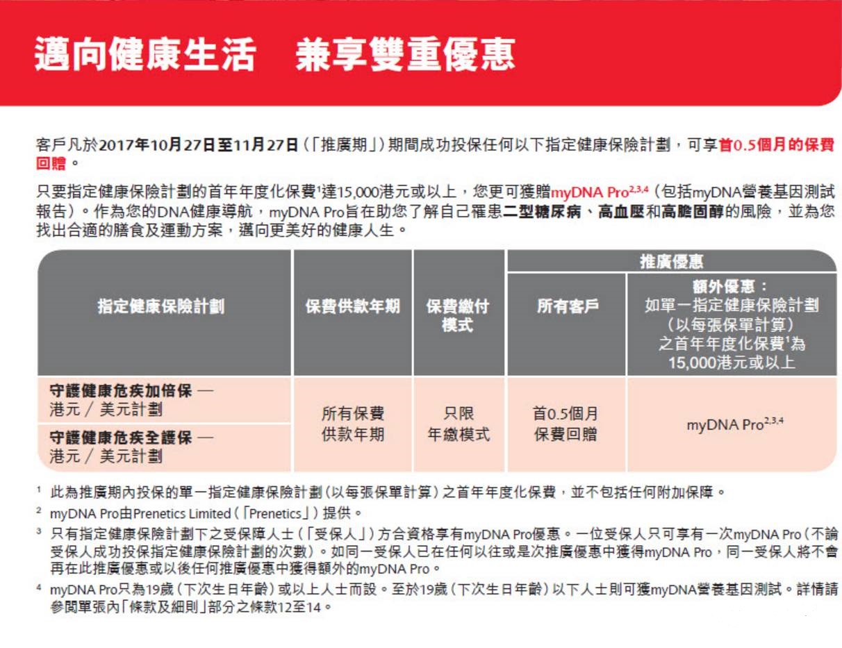 於2017年10月10日至11月30日(「推廣期」),客戶成功投保下列指定危疾保險計劃,可享受保費回贈優惠: