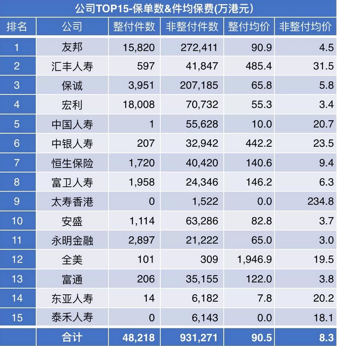 整付保單件均保費最高是全美人壽,高達1947萬港元。期交保單件均保費最高是太壽香港,高達235萬港元。