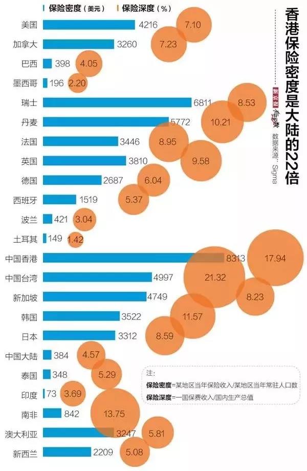 根據瑞士再保險公司Sigma的報告,2017年香港地區的保險密度高達8313美元/人,在亞洲排名第一。保險深度約為17.94%,在亞洲排名第二。