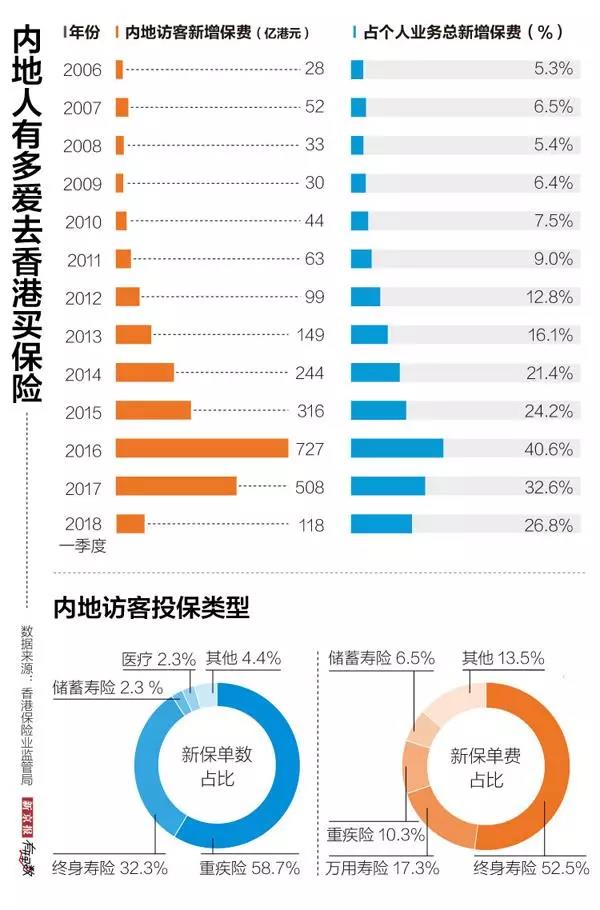 不過,受監管趨嚴和外匯限額等因素影響,在2017年,內地訪客的保費貢獻率連續八年增長後首次回落。