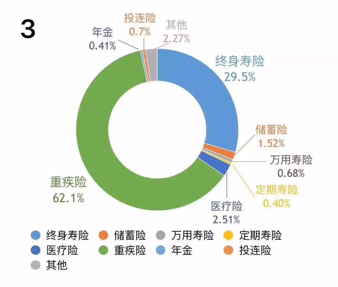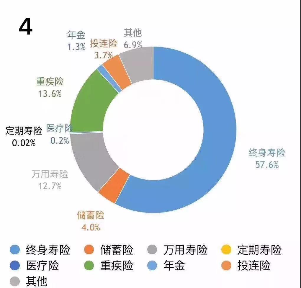 三、新單保單數統計,內地訪客購買重疾險的數量最多,持續上升,2018年占比為62.1%,遠高於2017年,展現出香港重疾險對內地訪客較強的吸引力;其次為終身壽險,占比29.5%,較2017年同期有明顯下降。