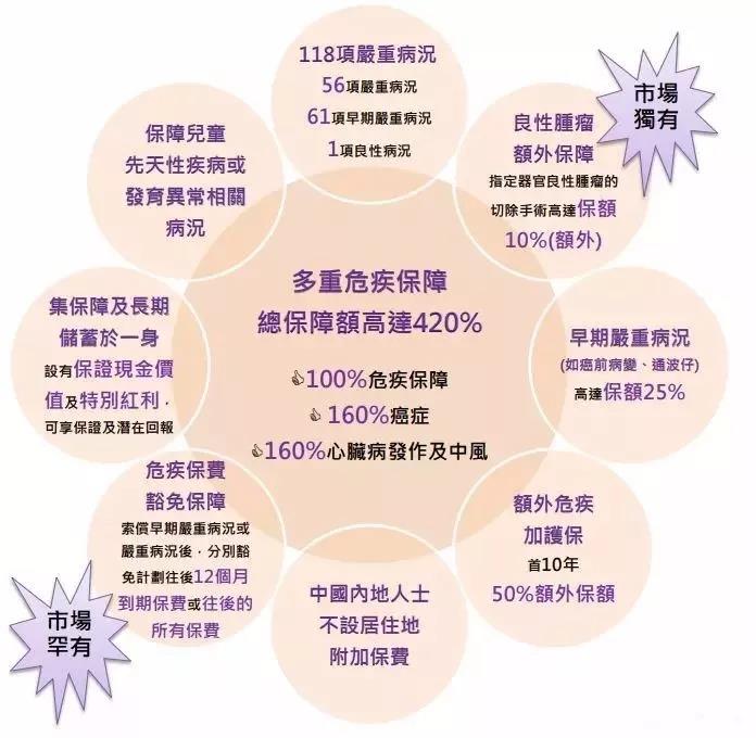 多重保障:可最多賠付5次,賠付總額可高達客戶所購買的基本保額的420%【=首次重疾(100%保額)+額外兩次癌症賠付(共160%保額)+額外兩次心臟病或中風賠付(共160%保額)】;