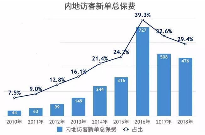 繼2016年的內地訪客赴港投保小高潮之後,近年的新增生意量達到了新的平衡並且逐漸回歸理性的狀態。相比於2017年全年新單保費508億港元(占比32.6%),2018年總體內地訪客總保費有稍許下降。但總體的保費結構更加合理,重疾險比例明顯增多。
