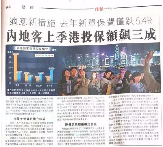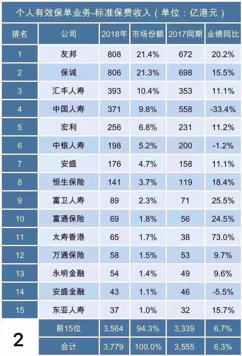 2019年3月15日,香港保險業監管局同時公佈了2018年全年度香港保險業臨時統計數字,個人壽險新單總保費總額為$1,618億港元,與2017年全年比較,上升了6.9%。