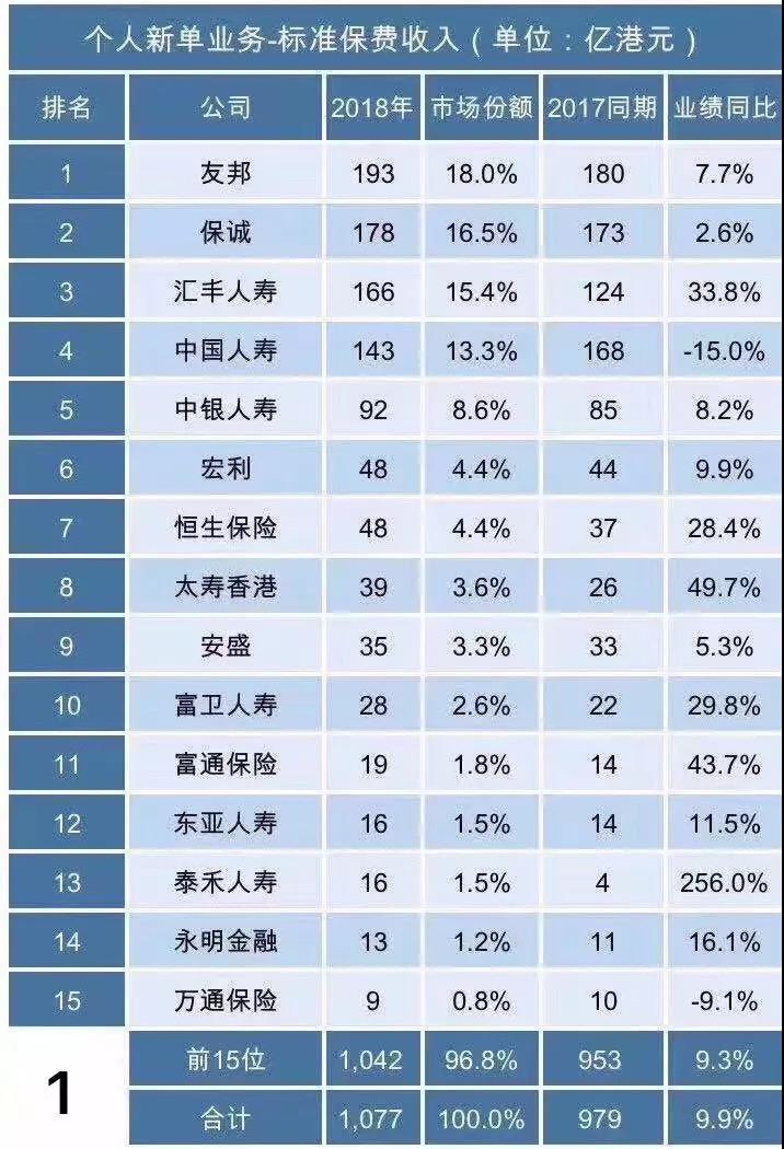 一、個人新單業務標準保費(年化保費+整付保費*10%),排名前四的公司分別為友邦、保誠、匯豐人壽和中國人壽海外。