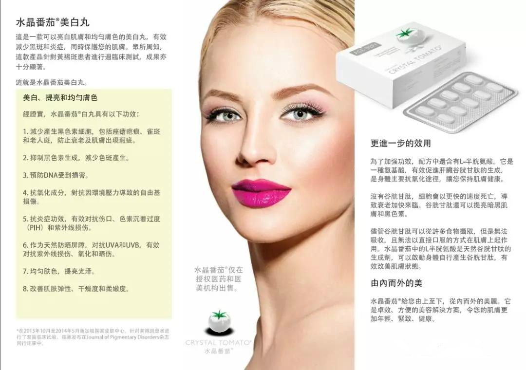 關於這點,女性同胞無需擔心,Crystal Tomato 水晶番茄美白丸是全世界唯一一款通過臨床驗證的美白丸,並通過新加坡藥監局批准。(新加坡藥監比澳洲TGA嚴,澳洲TGA比美國FDA嚴格)