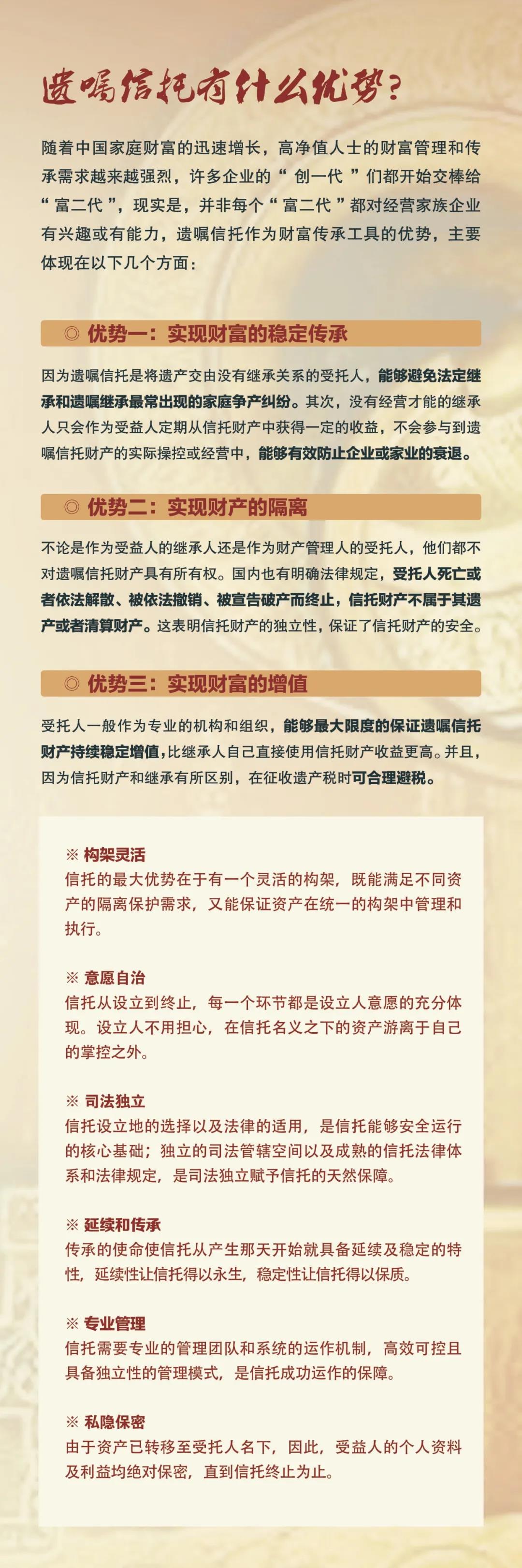 多元化的繼承制度,能夠滿足不同群體的需求,遺囑和信託的銜接能夠為高淨值人士提供財富傳承的新思路,也從側面說明,財富管理和財富傳承正逐漸發展和日趨完善。遺囑信託寫入《民法典》的確是一大進步,但是從目前的法律規定來看,不論是《信託法》還是《民法典》,都沒有對其進行制度化的規定,這也是目前遺囑信託實施的主要困境。