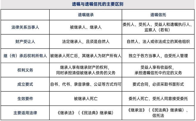 遺囑和遺囑信託的區別大致可以從法律關係當事人、財產受讓人、繼(傳)承後權利所有人、權利義務、成立要式、生效條件、適用法律幾個方向進行對比,我們通過下麵的表格能有個較為清晰的比較。