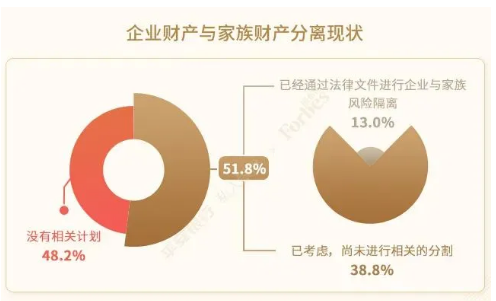 在家族企業與家族財產權利界限的問題上,白皮書發現,參與者對於企業與家族財產權利風險隔離意識還略顯薄弱。只有13.0%的參與者表示已經將家族的私人資產與企業資產相分離。
