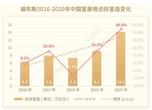 值得一提的是,白皮書顯示,疫情並沒有放慢中國造富巨輪的前進速度,2020年福布斯中國富豪榜上榜者的總財富值由一年前的9.1萬億人民幣飆升至14.1萬億人民幣,近三分之二的上榜者的財富在過去一年時間有所上漲。