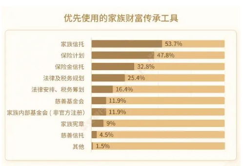 在家族辦公室服務落地執行工具的選擇上,白皮書顯示,被調研者會優先使用的是家族信託、保險計畫和保險金信託。其中,家族信託在具有不同特徵的被調研者心中都是首選的家族財富傳承工具,也是最受青睞的婚姻風險防範工具。