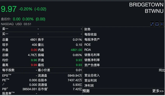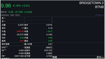 截至發稿,電訊盈科總市值人民幣337.79億元;盈大地產總市值11.62億港元(約合人民幣9.39億元);Bridgetown Holdings總市值7.42億美元(約合人民幣46.88億元);Bridgetown 2 Holdings總市值3.72億美元(約合人民幣23.5億元)。