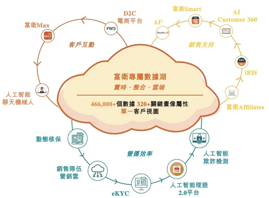 而數據分析及人工智慧架構是富衛集團數碼核心的基石。如今,公司10個市場中的其中8個實行了人工智慧分析,截至2021年12月,富衛集團資料庫已能夠合併及分析來自超過47萬個數據點的數據,並為單一客戶呈列超過320個關鍵組合屬性。以推出自動化及針對性的行銷活動,從而及時滿足不斷變化的客戶需求。