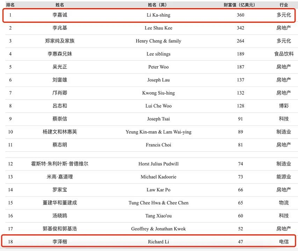 李澤楷則以47億美元(約合人民幣297億元)的財富值位列第18,財富獲取來源主要是電信行業。