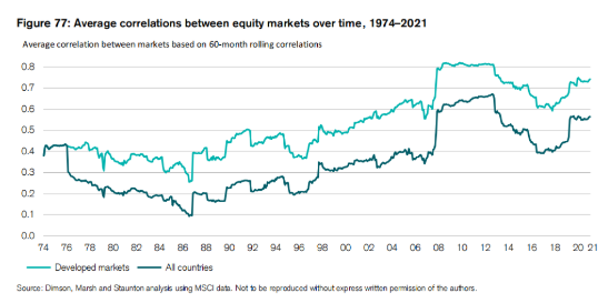(1974-2021期間,發達國家及全球各國的股市平均相關性)