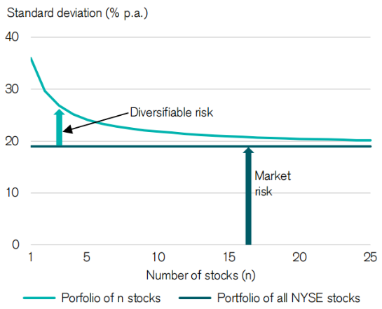 比如很多投資者認為多元化,等於“分散”買入不同股票。隨著不同股票加入投資組合,一開始風險會迅速被分散,但隨著越來越多股票加入投資組合,風險分散變得越來越慢,甚至趨同於整體市場表現。