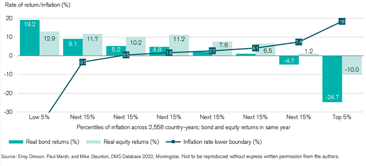 總體而言,當通脹率處於較高水準時,股市和債券市場的實際表現相對較差(但並不是絕對情況)。