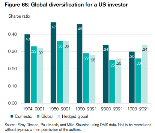 過去50年間,在美國投資的夏普比率要高於全球投資的夏普比率。這意味著投資者在美國國內投資獲得的回報更豐厚。