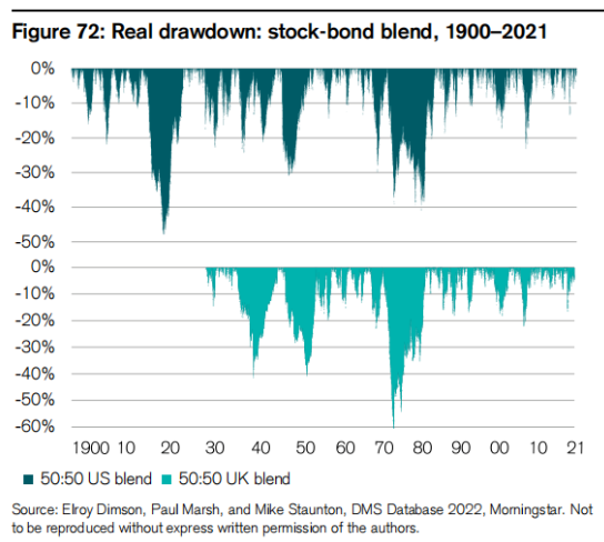 (美國和英國以50:50配置股票/債券的真實回撤)