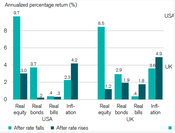 降息期間,英國股市年化實際回報率為8.5%,債券為2.9%。但是加息和降息後,對票據的回報影響不顯著,或是說無明顯規律。