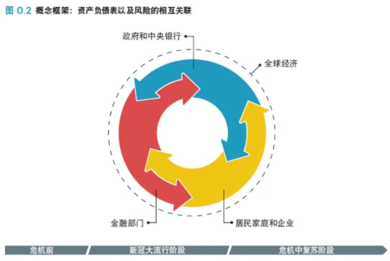 儘管新冠危機對家庭和企業收入的影響最為直接,但它帶來的巨大衝擊會通過連接家庭、企業、金融機構和政府等各方面財務健康狀況的多種管道對整個經濟造成影響(見圖O.2)。由於各部門之間存在這種關聯,如果一個部門的金融風險上升並且得不到控制,就很容易向其他部門外溢,在更大範圍損害經濟穩定。當家庭和企業承受財務壓力時,金融部門會面臨更高的貸款違約風險,提供信貸的能力也會降低。同樣,當公共部門財務狀況惡化時——如債務上升、償債支出增加,政府向家庭和企業提供支持的能力也會削弱。