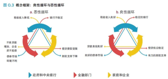 然而這種關係並非不可改變。設計良好的財政、貨幣和金融部門政策可以抵消和減少各部門之間相互交織的風險,將它們的聯繫從惡性“末日迴圈”轉變為良性迴圈(見圖O.3)。