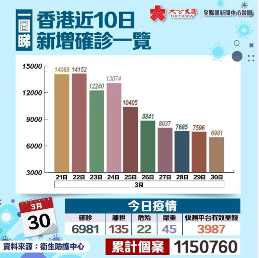 香港疫情逐漸回落,已經連續5天確診跌破1萬了!