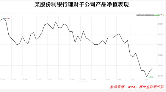 從以下圖某股份制銀行理財子公司某只產品淨值表現來看,這類開放性的淨值產品波動大,適用的風險等級高。該產品在2021年2月5日成立,在成立後近一年的時間內,虧損近20%,與同期滬深300指數跌幅為24%相類似。無論是產品定位還是產品投向、業績表現都與市場中其他權益類產品並無二致。這類產品多數為開放型產品,淨值真實體現了所投資產的市場價值,當投資者難以忍受產品淨值的大幅度下跌時,部分會選擇賣出止損。