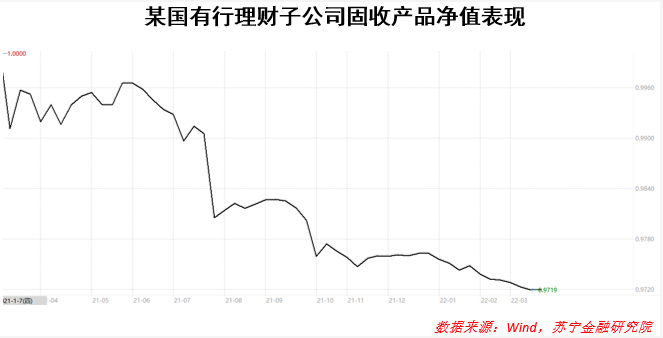 而除了這類出現較大幅度淨值下跌的產品外,另一種固收類產品也更值得投資者關注。這類產品多數虧損幅度較小,大多在3%甚至1%以內,淨值波動也較小,產品底層資產為債券類資產,這種產品的破淨虧損,我們暫且稱之為“假虧損”。當然,所謂“假虧損”並非是說這種產品虧損是假的,而是由於估值方面的不同,導致產品淨值在封閉期出現的“虧損”。