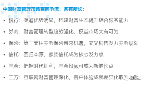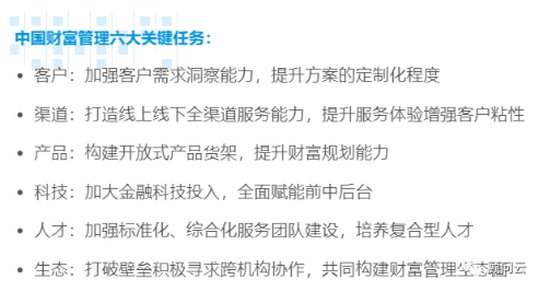 報告分為中國篇和全球篇。中國篇從政策導向、市場趨勢角度出發,對銀行、券商、保險、信託、基金和三方財富管理公司進行研判,從客戶、管道、產品、科技、人才、生態等多維度指出未來財富管理關鍵任務。