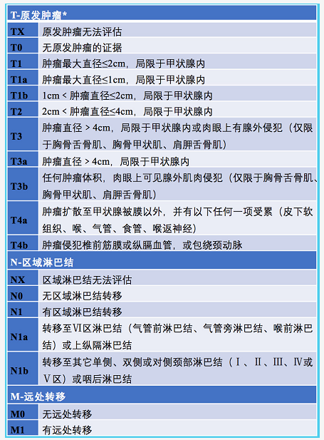 甲狀腺癌,國際上最通用的是根據TNM分期,T代表原發腫瘤的大小,N代表區域淋巴結是否有轉移、M代表是否有遠處轉移,詳情參考下表。