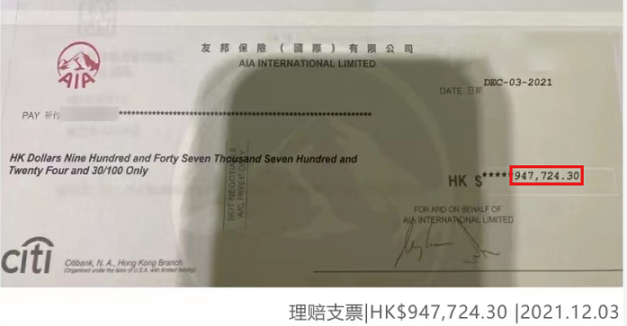 一張香港友邦的理賠支票:金額947,724.30港幣,日期為2021年12月3日。
