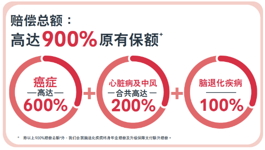 全面保障115種疾病,為癌症、心臟病及中風、腦退化疾病提供多重賠償,總保障額度高達900%。