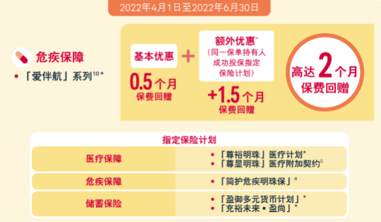 疫情非常時期的非常產品,加量又降價,相比上一代產品保費下調4%-11%。2022年6月30日前成功投保「愛伴航」/「愛伴航-首護摯寶」,限時享0.5個月保費回贈!