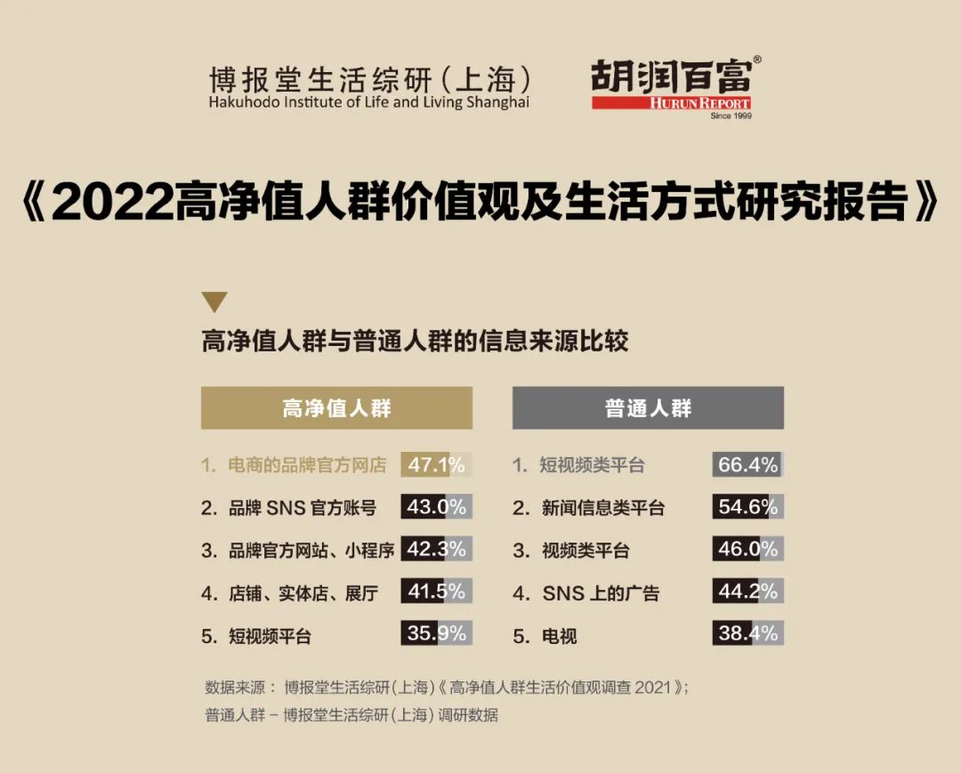 4.收集資訊的管道上,高淨值人群與普通人群也略有差異。相對而言,高淨值人群更偏愛官方資訊管道,如品牌官方網店(47%),品牌社交媒體平臺官方帳號(43%)等;而近2/3的普通人群首選短視頻平臺作為主要資訊渠道。