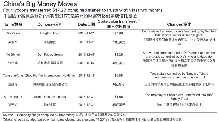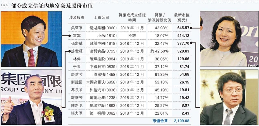其實僅18年年底,內地超級富豪成立信託或通過信託轉讓股權的名單就比我們想像的要多得多得多,涉及的上市公司總市值超過了2000億美元。