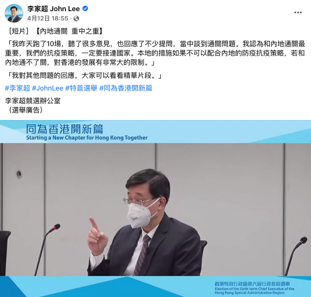 對於大家最關心的通關問題,李家超在社交平臺上表示:與內地通關是重中之重。