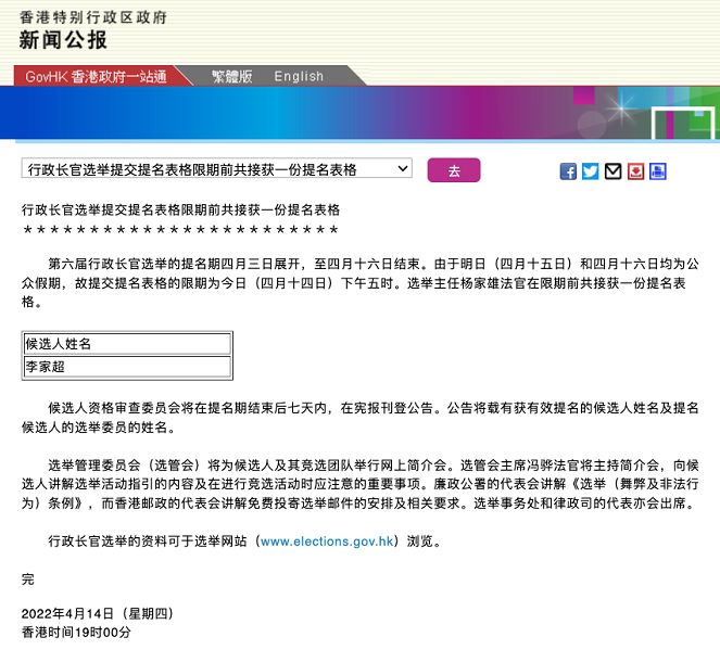 香港特區政府選舉事務處:行政長官選舉提交提名表格限期前共接獲一份提名表格。