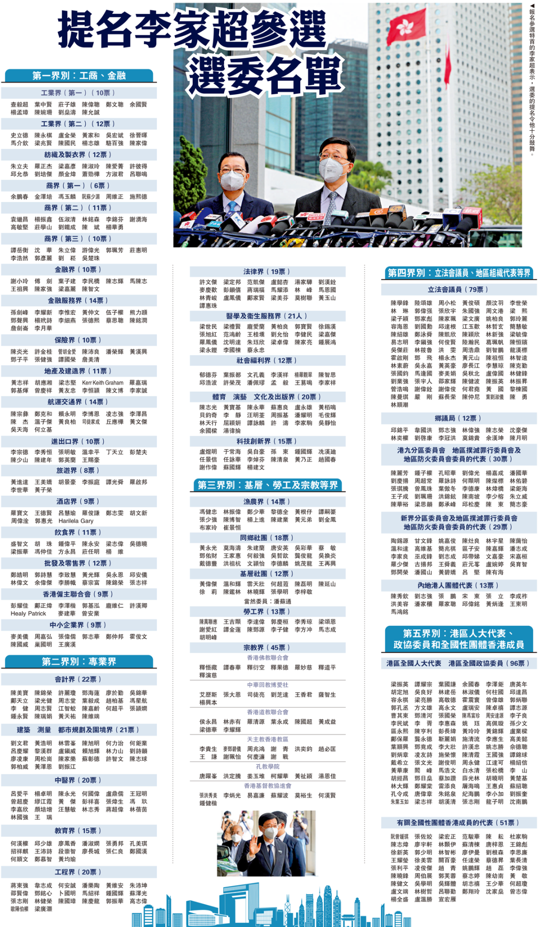 李家超取得了786張選委提名票,來自5個界別,工商金融界最多(189票)。
