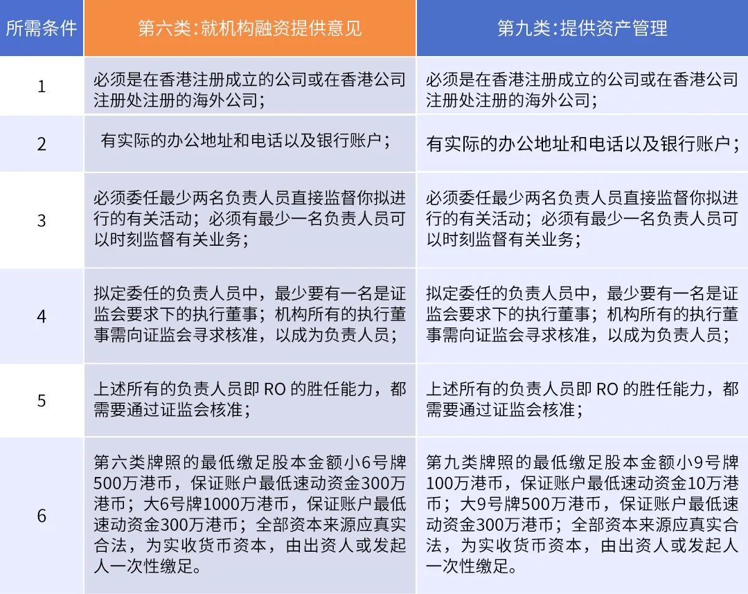 首先在中國香港想要申請SPAC,發起人必須持有中國香港第6類和第9類金融牌照。其中第6類為機構融資諮詢業務牌照,擁有此牌照,才可就機構融資提供意見。對資金也有一定要求,如不持有客戶資產,則要有不少於10萬港幣的流動資金;如果擔任擬上市公司的保薦人,則認繳資本不低於1000萬港幣,流動資金不低於300萬港幣。設立SPAC顯然符合第二種情況。