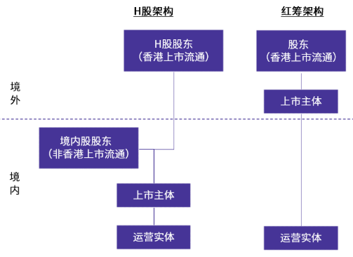 內地企業除了採用上述H股方式直接赴港上市外,另一種更為普遍的方式是採用“紅籌”架構,即以境外公司作為上市主體,由境外公司持股境內運營實體,實現境內企業的間接上市。紅籌可細分為“大紅籌”與“小紅籌”,前者主要是境內法人進行境外投資形成,多用於早年上市的大型國有企業,近年少有出現;後者主要是個人進行境外投資形成,多用於民營企業,是最常見的紅籌模式。下文討論的“紅籌”特指“小紅籌”。