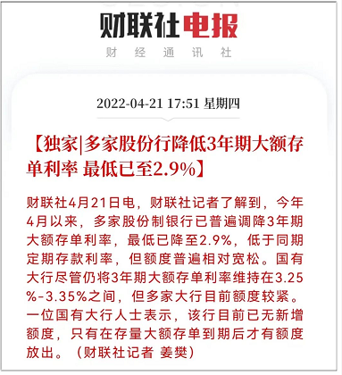 4月以來,多家股份制銀行已普遍調降3年期大額存單利率,最低已降至2.9%,低於同期定期存款利率,但額度普遍相對寬鬆。